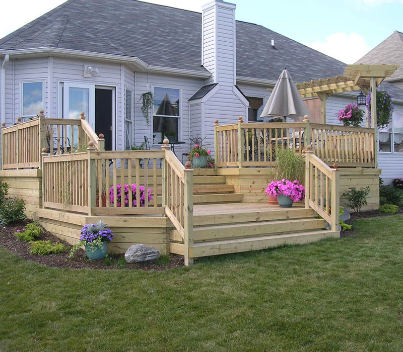 All of our decks are custom built with #1 MicroPro treated Red Pine, which is the best material for use in decks. The #1 should represent that there are fewer knots, no wane or bark and of course no rot. This is inspected by the National Lumber Industry, and carries a manufacturers lifetime warranty against rot or deterioration. As a company, we are very pleased with Red Pine as a deck material. It produces less sap and less twisting, as compared to Yellow Pine or Ponderosa Pine. The option of using composite or vinyl materials is also available.